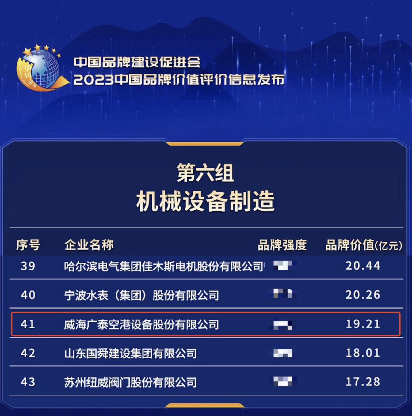 2023年5月11日,新華社、浙江省人民政府、中國品牌建設(shè)促進(jìn)會、中國資產(chǎn)評估協(xié)會等單位在浙江德清聯(lián)合發(fā)布“2023中國品牌價(jià)值評價(jià)信息”。威海廣泰空港設(shè)備股份有限公司(簡稱“威海廣泰”)在此次發(fā)布評價(jià)機(jī)械設(shè)備制造組中,品牌價(jià)值獲評為19.21億元。“中國品牌價(jià)值評價(jià)信息發(fā)布”…