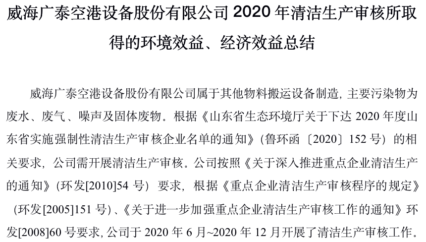 威海廣泰空港設(shè)備股份有限公司2020年清潔生產(chǎn)審核所取得的環(huán)境效益、經(jīng)濟(jì)效益總結(jié)威海廣泰空港設(shè)備股份有限公司屬于其他物料搬運(yùn)設(shè)備制造,主要污染物為廢水、廢氣、噪聲及固體廢物。根據(jù)《山東省生態(tài)環(huán)境廳關(guān)于下達(dá)2020年度山東省實施強(qiáng)制性清潔生產(chǎn)審核企業(yè)名單的通知》(魯環(huán)函〔…